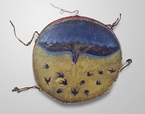 In the nineteenth century, the Ghost Dance tradition became sacred among many indigenous North American cultures. A drum, created by the indigenous Pawnee man George Beaver in 1891, was part of the sacred Ghost Dance movement. The drum depicts the Thunderbird as a harbinger of war showing the bird descending from a storm bringing with it war and battle. Many of the tales, poems and dances about the Thunderbird associate the storm-bringing mythical being with the approach of warfare and the bringer of battle.
