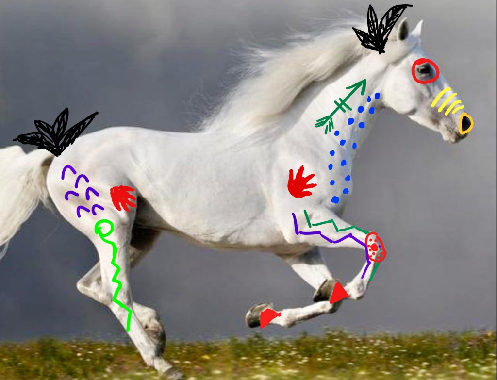 During my research into indigenous North American customs and cultures, I came across reference to the markings painted on the war horses. There are many Amerindian cultures and tribes which exist today and many more that have been lost. I acknowledge with respect, that these symbols are not exhaustive nor do they belong to a single tribe. The markings explained below will have different interpretations specific to each tribe.