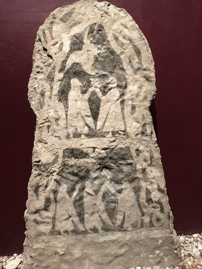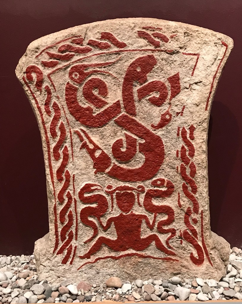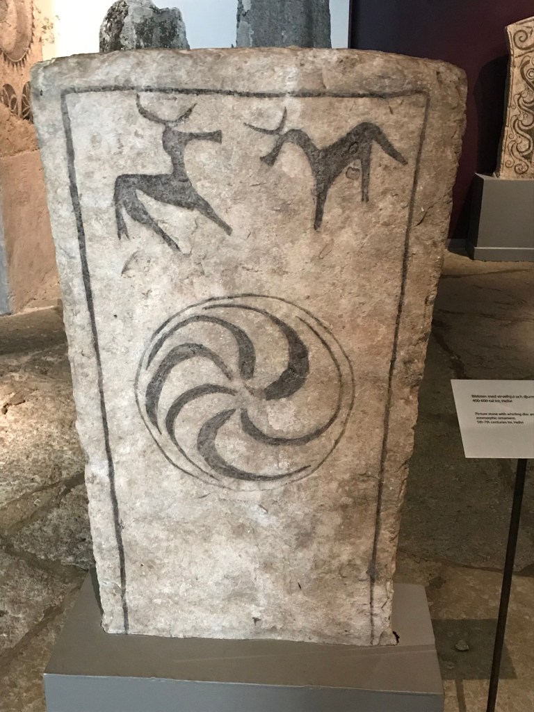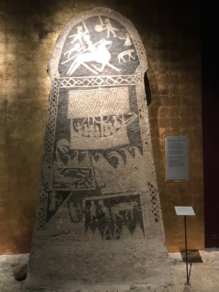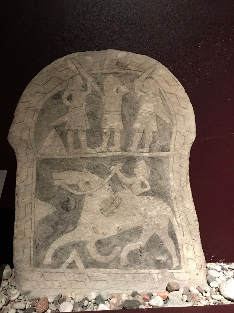 The Gotland Museum collections contain some of the oldest picture stones in Sweden with many dating from the prehistoric era of circa 9000 years ago and including the pre-Viking Age era of circa 700 AD. The earliest picture stones feature animal and geometric motifs before the more familiar Celtic styles of decoration are incorporated into the picture stones. Some of the largest picture stones are well over 6 ft and depict themes and motifs mentioned in Norse mythology. There is one famous picture stone that appears to depict common themes and characters from Norse mythology with a warrior riding into battle on an eight-legged horse, a wolf and a woman holding out a drinking horn. Below that scene is a Viking ship and armed warriors and possibly a Valkyrie or similar winged female archer.