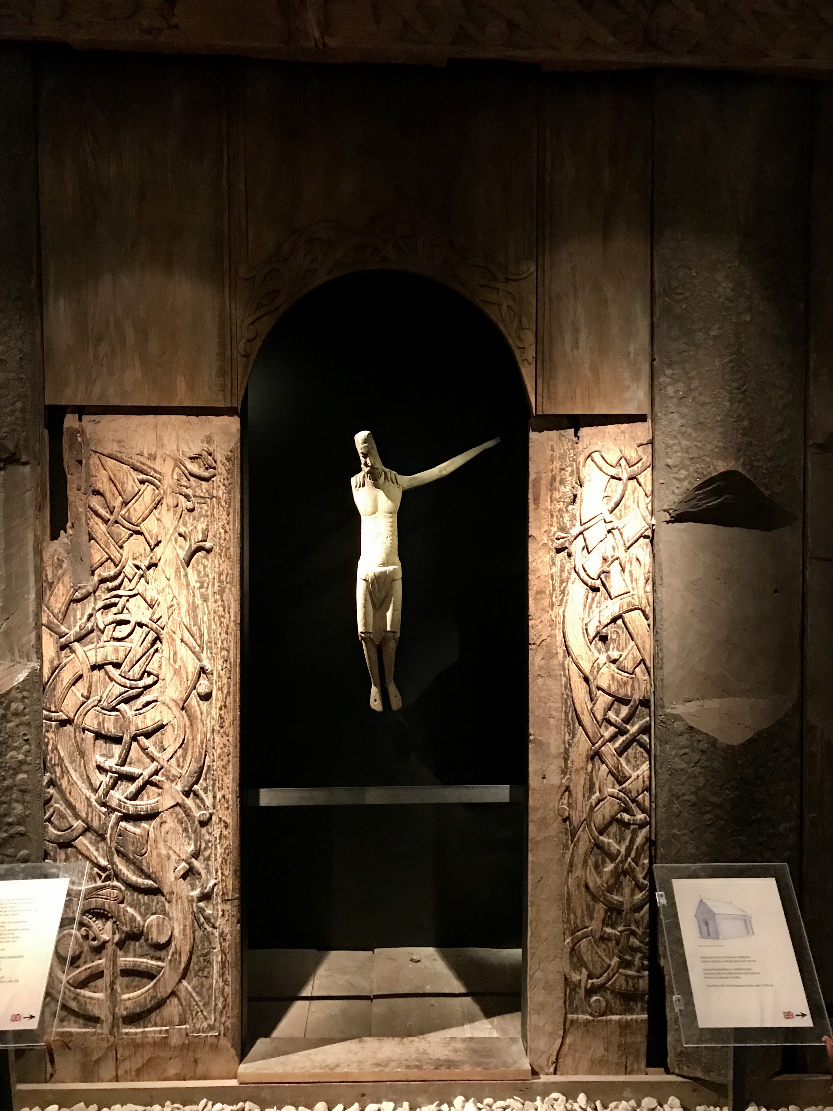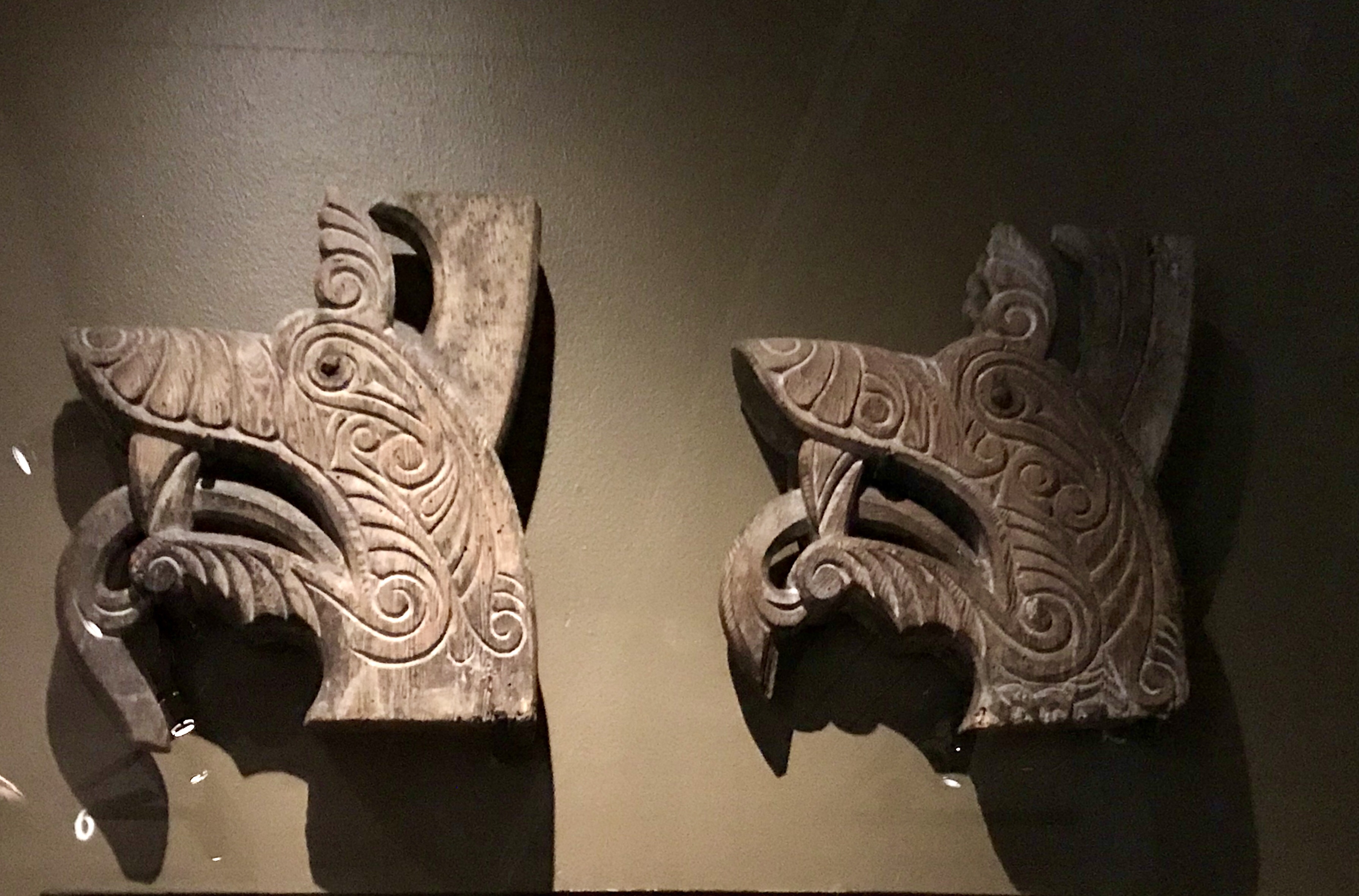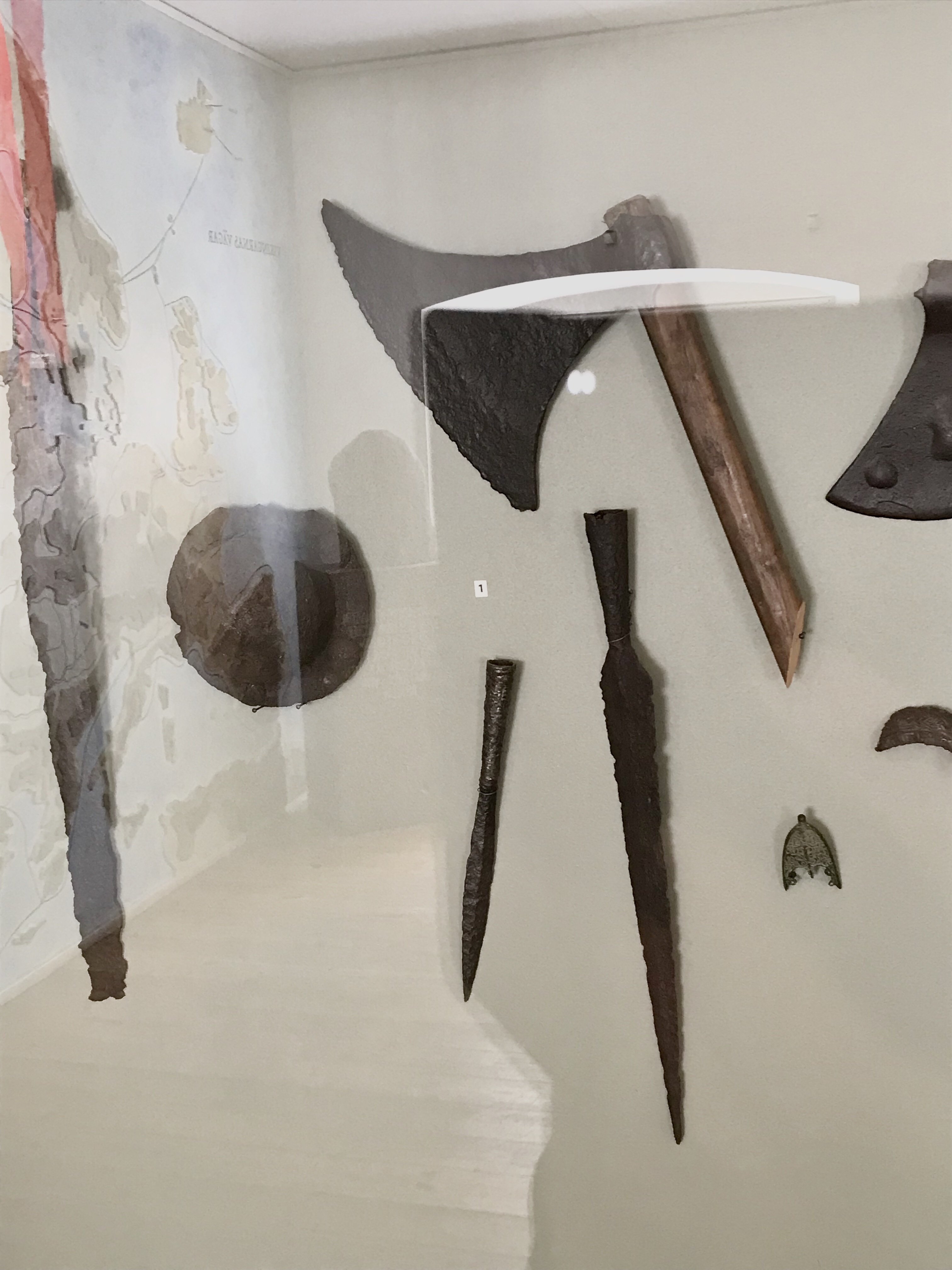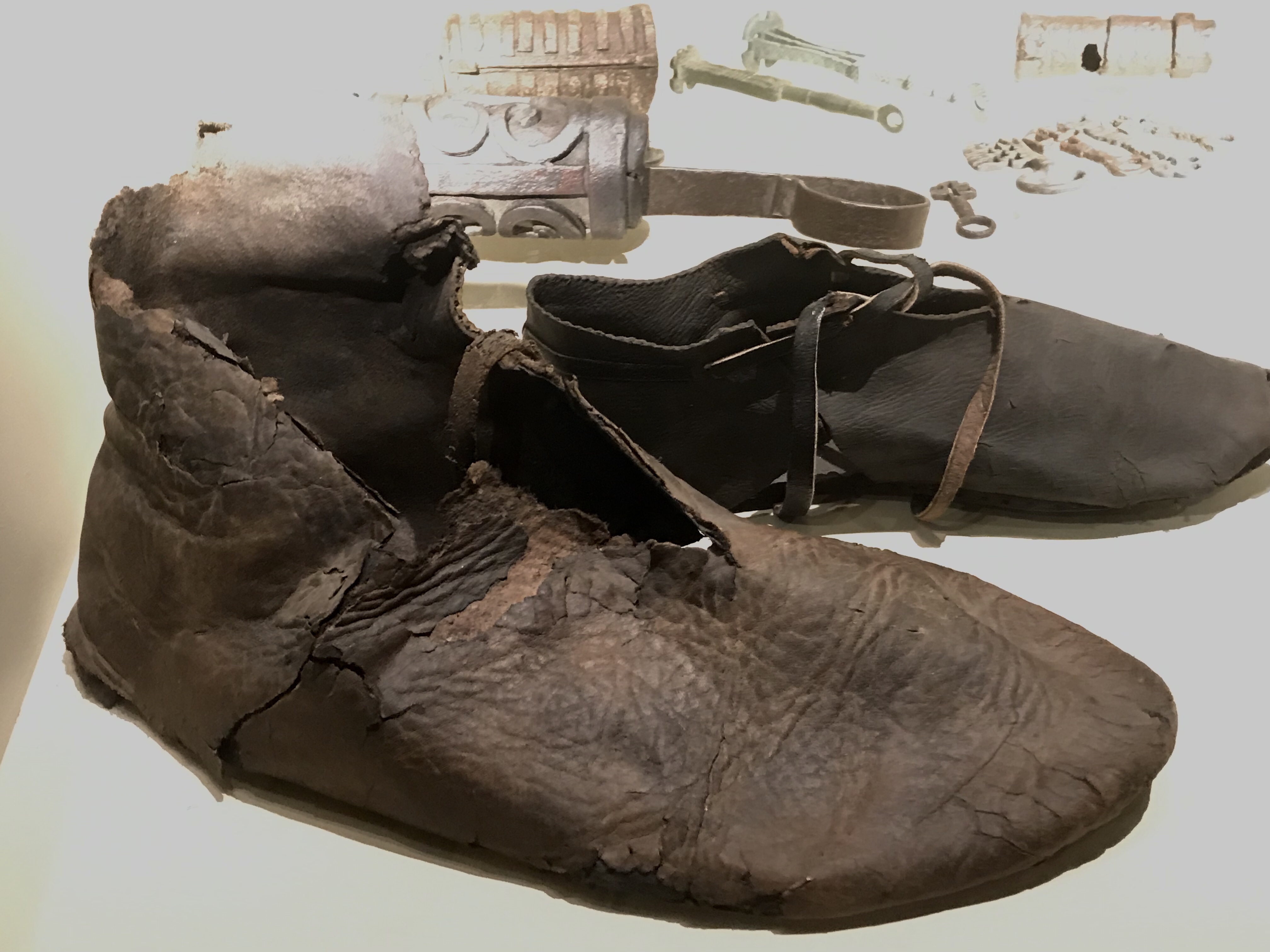 Gotland Museum contained an interesting collection of archaeological and historical items from the pre-Viking Age era, Viking Age and through to the Middle Ages. Items from the Viking Age included axe blades and swords recovered from local archaeology sites, carved game pieces made from bone and horse teeth. A gilt weather vane for a Viking longship appears an extraordinary extravaganza by modern standards but retains the deep swirling pictographs on the surface. The arrival of Christianity to Gotland Island was ushered in slowly with early wooden churches a solemn, pagan-appearing place, the wooden form of Christ more resembling Odin during his search for knowledge as he hung upon the tree Yggdrasil. Symbolic jewellery like Thorโs hammer was slowly replaced by the crucifix and the combination ancient and โnewโ religions defined by the crucifix marked by runes scored into its surface. Other unusual items included Wolfs-head endpieces for a row of church pews, near-immaculately preserved leather boots and the old former seal of Gotland Island established in 1280.