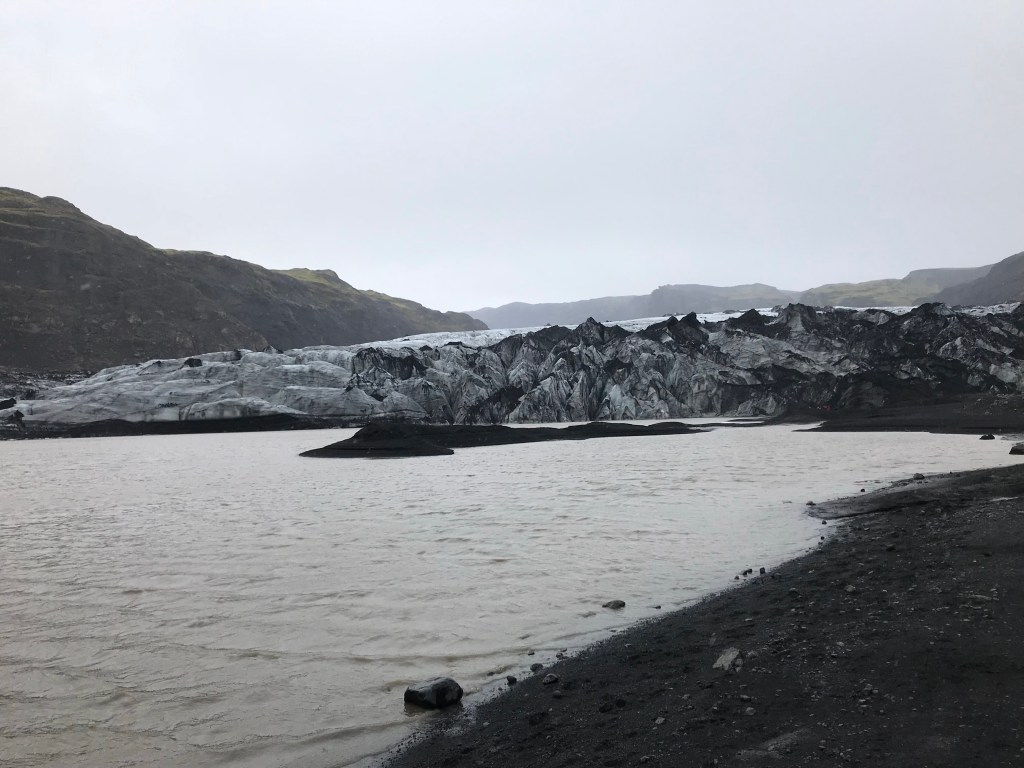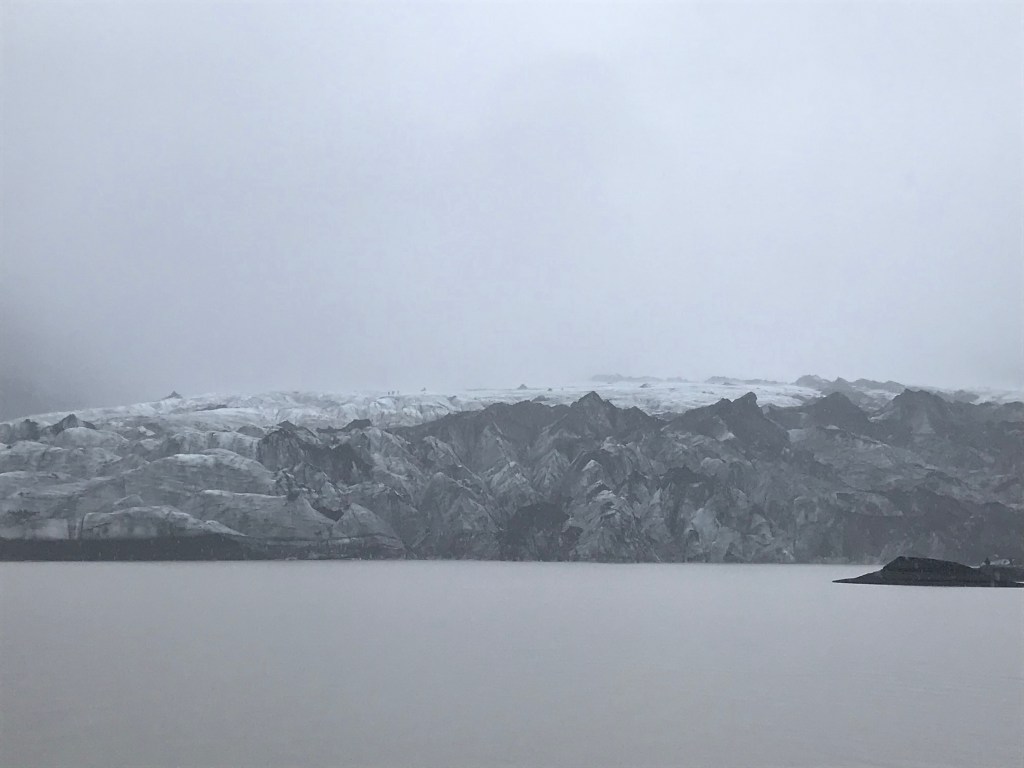 The final view looking back to Myrdalsjokull as the weather closed around the glacier and lagoon, rain and light snow obscuring much of the way back we had come.