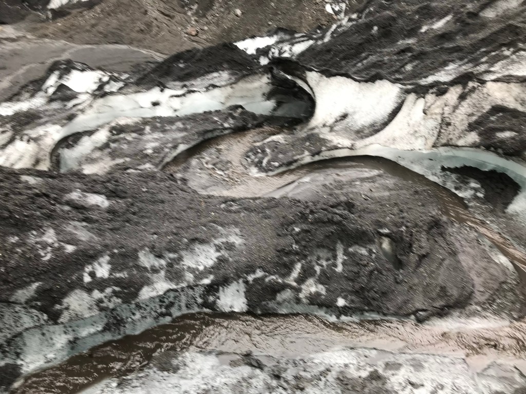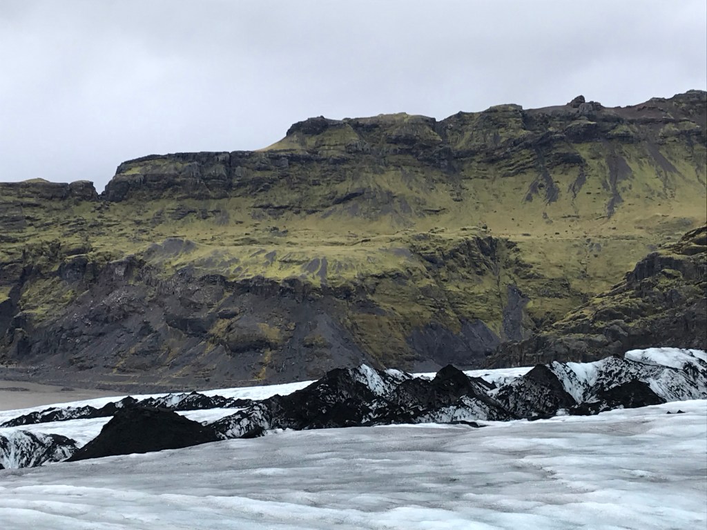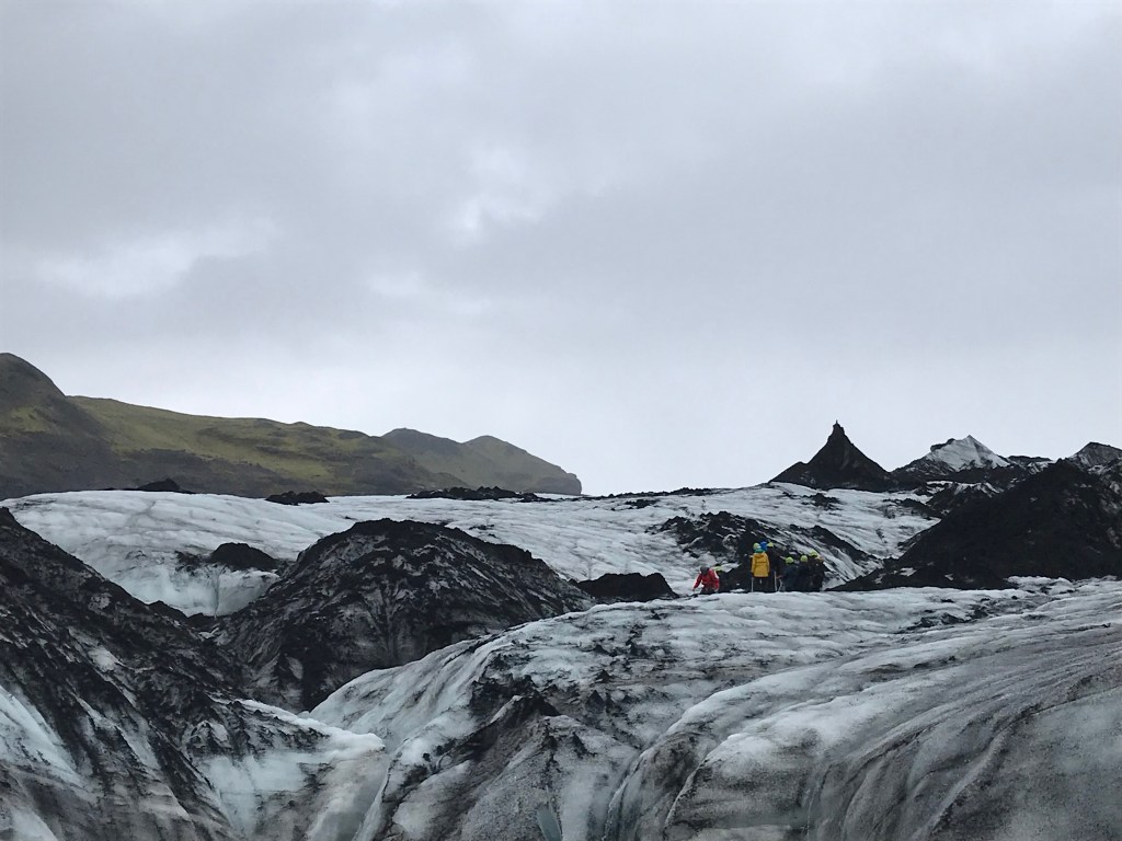 The 20 minute hike to the Sólheimajökull glacier includes traversing the edge of the lagoon formed by glacial melt. Each year the size of the lagoon increases with warmer global weather influencing the temperature and extent of thawing and glacial melt each year. In Iceland, the constant volcanic activity means that the glaciers are often streaked or covered in volcanic ash and these are known as “dirty glaciers” due to their black streaked appearance from frequent volcanic eruptions. The lagoon is also formed from volcanic sand and large pinnacles of volcanic ash are common on the glacier surface.