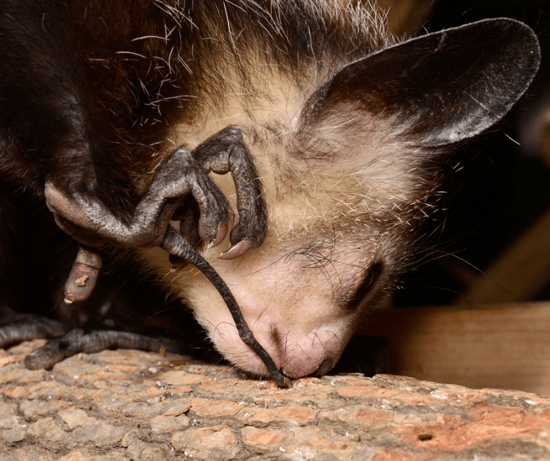 Aye-ayes are medium-sized nocturnal lemurs and are mostly black but have large, highly mobile ears for tracking minute sounds. They’re also the only primate with continuously growing incisors which make them look rodent-like. Most notable of the aye-aye’s unusual physical features is it’s long, thin middle finger which is used to tap rapidly on decayed wood where their sensitive hearing helps detect insect larvae beneath. They then gnaw holes into the wood with those rodent-like teeth and use the long, skeletal-like finger to skewer and scoop out insect larvae.