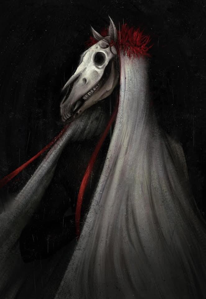 The Mari Lwyd has a horse skull for a head and lights or baubles for eyes. Her mane is made of colourful streamers, sometimes made of holly and ivy. She is covered in a white cloak from her skull attached to a pole. The person inside the Mari Lwyd controls the mischievous nature and often snaps the bony jaw at you.