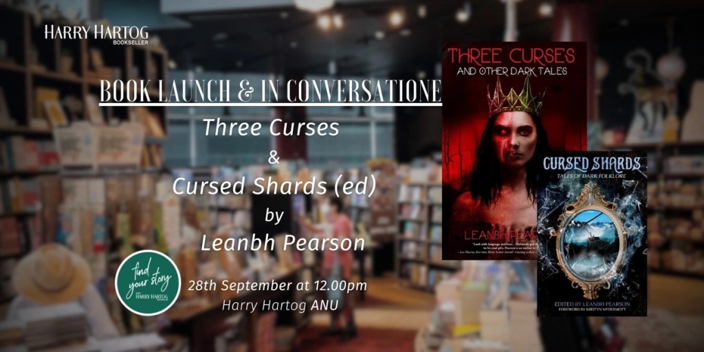 I am thrilled to announce that I’ll be in conversation with the delightful Leife Shallcross to launch of my collection Three Curses & Other Dark Tales and edited anthology Cursed Shards from IFWG Publishing of dark tales inspired by fairytales, folklore, magic mirrors, wicked Fae and Curses!
